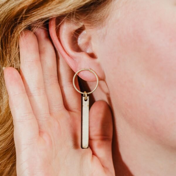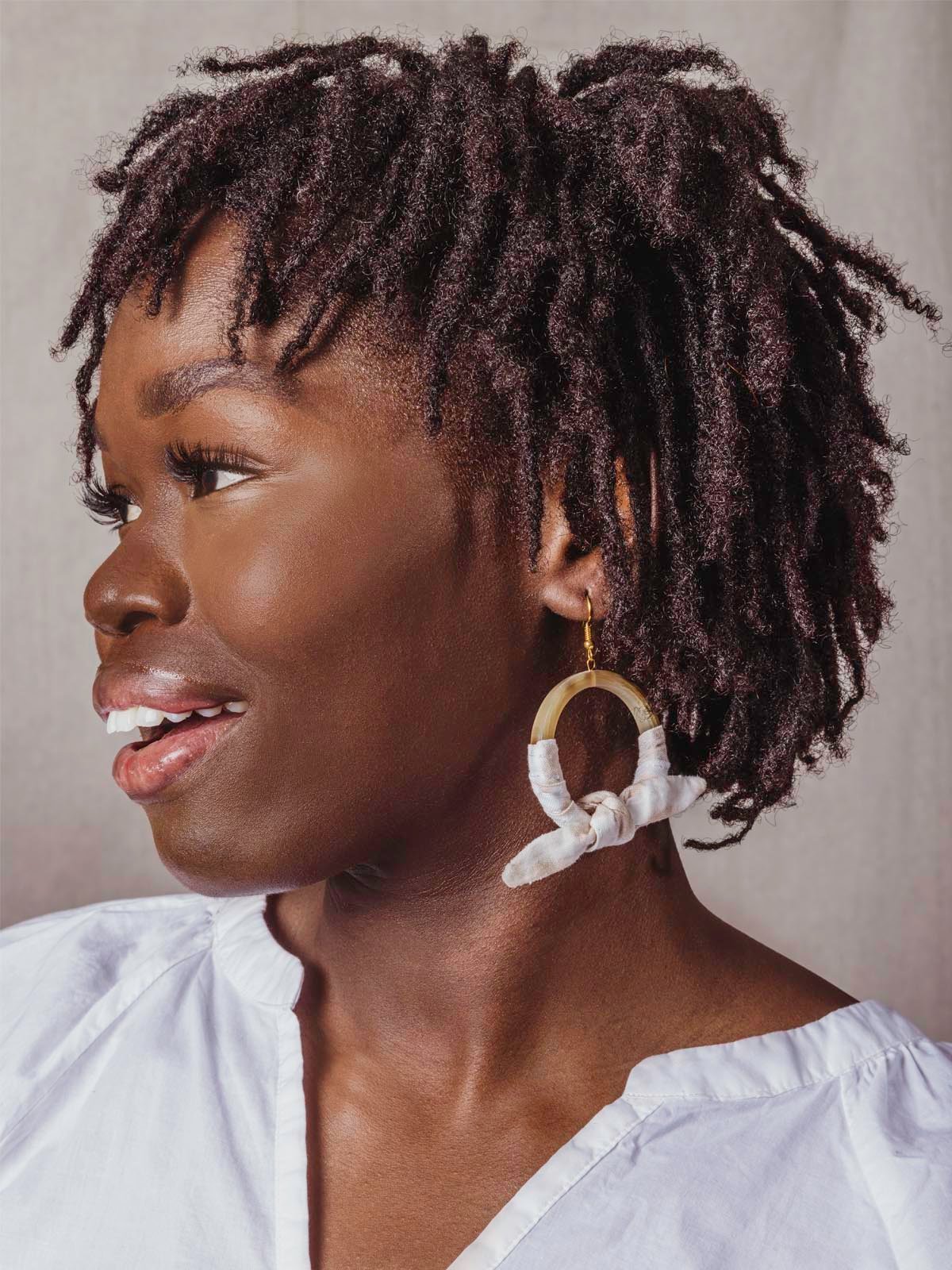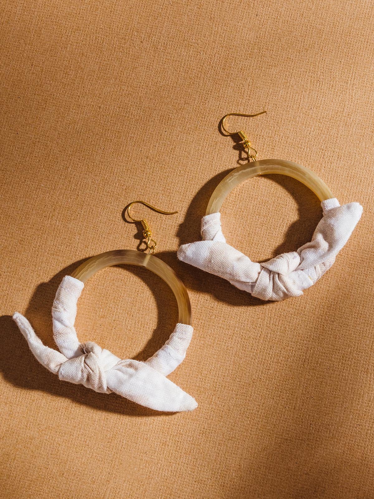 Natural horn wrapped in pretty tan and white bows make for a sweet twist on the classic hoop earring. Add these charming handmade earrings to your own collection or gift them to a friend as a classy and cute gift!